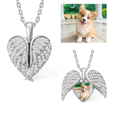 Custom Photo Angel Wings Heart Locket Necklace, Sterling Silver 925 Guardian Angel Wings Necklace with Cubic Zirconia, Memorial Gift for Pet Mom/Dad