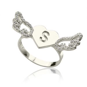 Heart Angel Wings Ring Engraved Initial & Birthstone Sterling Silver