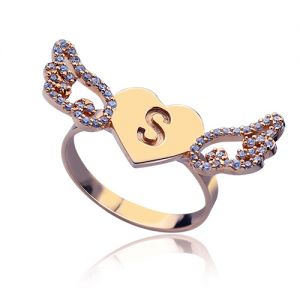 Angel Wings Heart Ring with Birthstone & Initial 18k Gold Plated